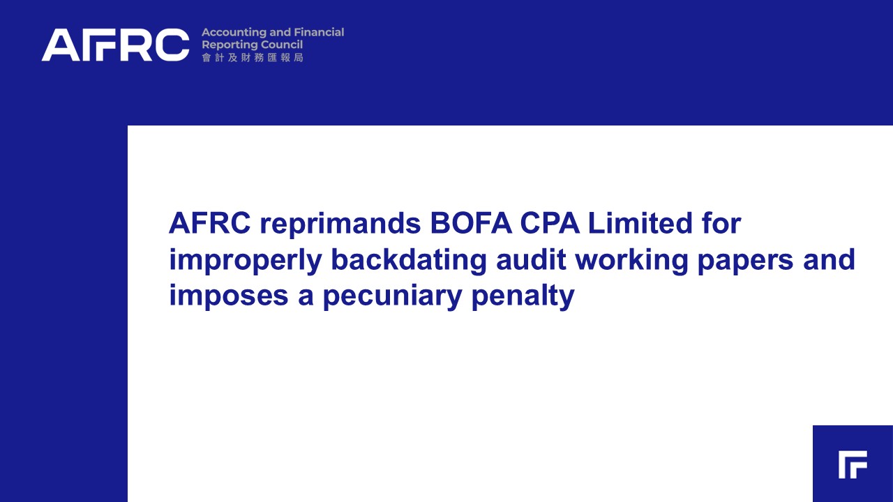 The AFRC has sanctioned BOFA CPA Limited (BOFA) for improperly backdating audit working papers in two audit engagements.