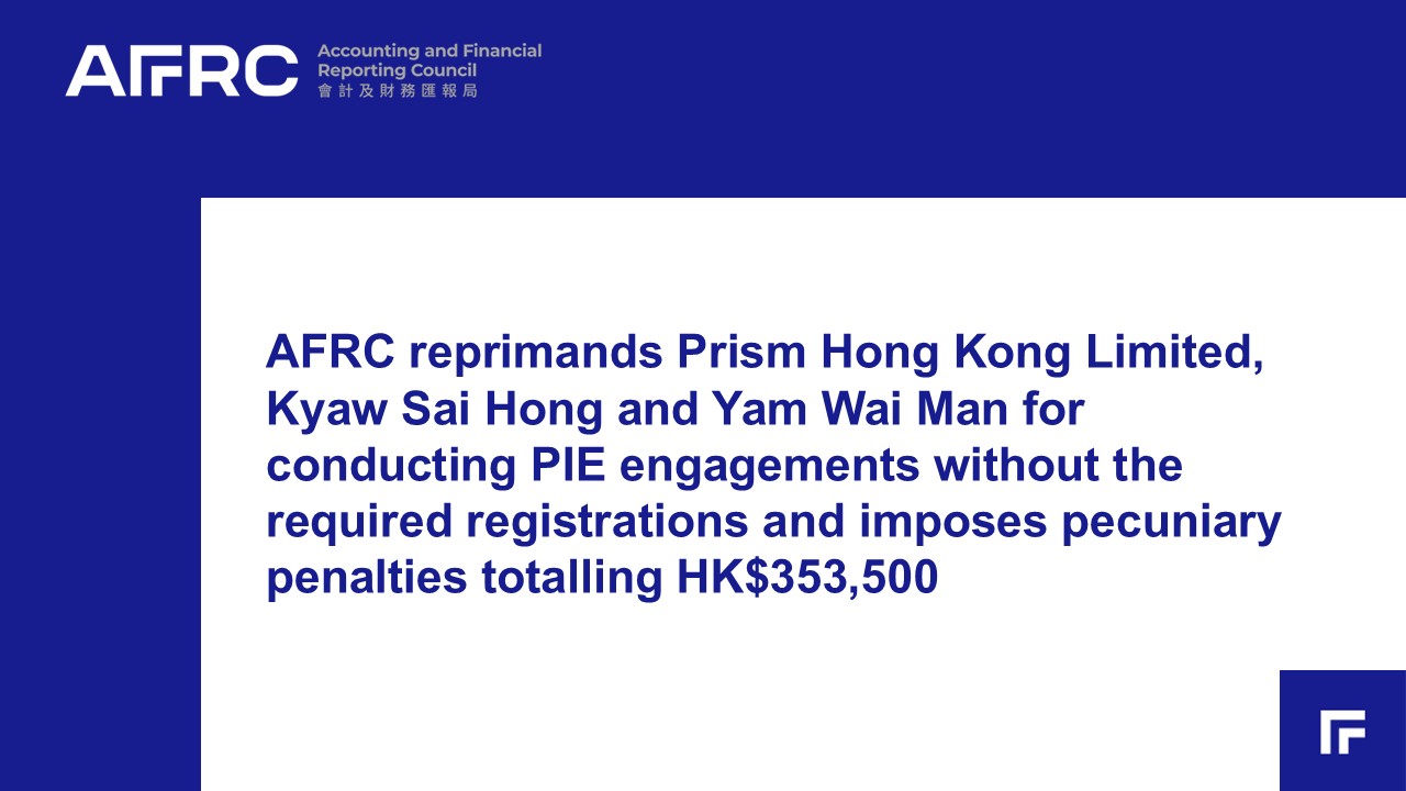 The Accounting and Financial Reporting Council (AFRC) has sanctioned the PIE auditor Prism Hong Kong Limited (Prism), Mr Kyaw Sai Hong (Kyaw) and Mr Yam Wai Man (Yam) for conducting various PIE engagements in 2023 without the required registrations, in contravention of sections 20D, 20E and 20V of the Accounting and Financial Reporting Council Ordinance (Cap. 588). The AFRC has: