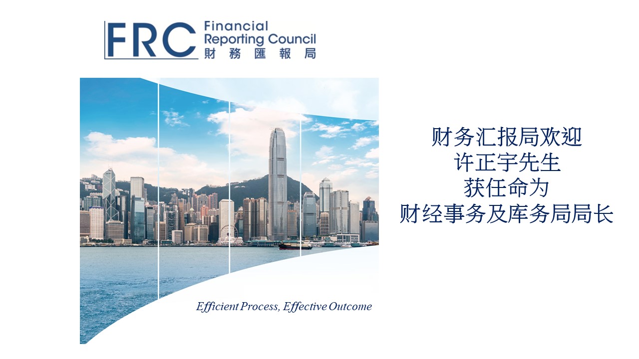 财务汇报局欢迎许正宇先生获任命为财经事务及库务局局长。财务汇报局主席黄天祐博士表示:「财务汇报局欢迎许先生的任命,并期待与他及其团队紧密合作。」详情请按此​