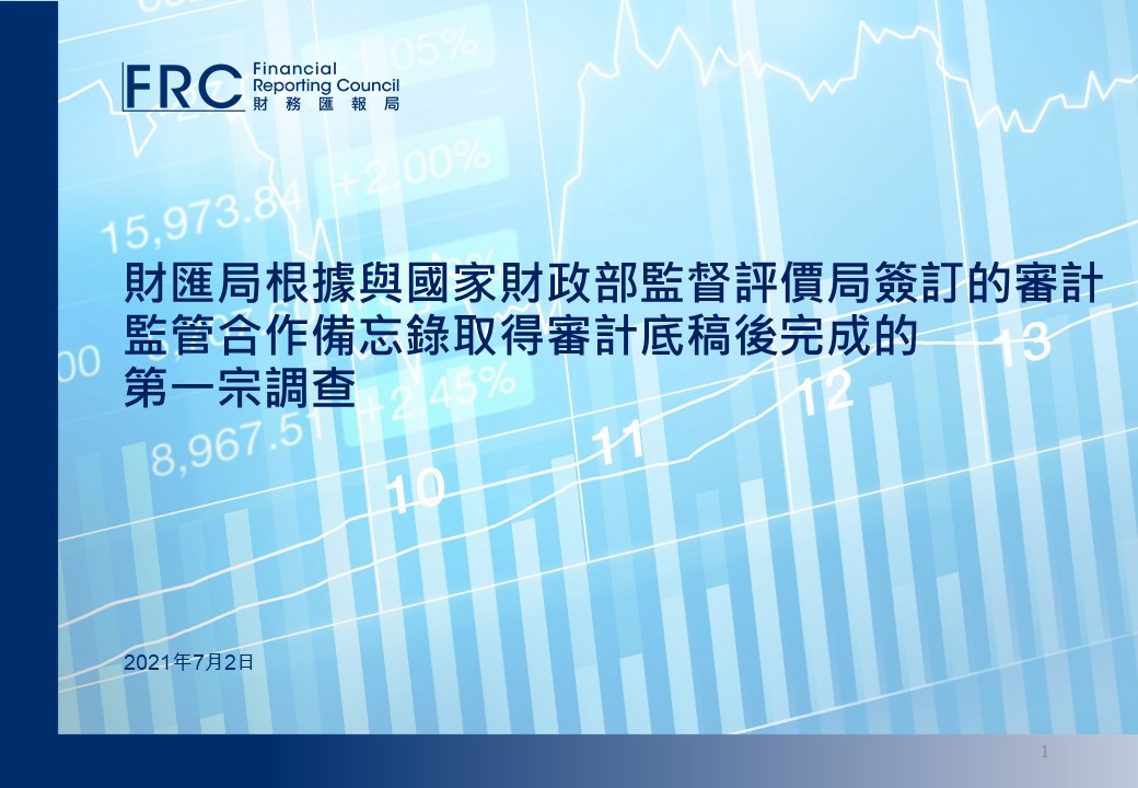 2021年6月15日,財匯局採納了一份調查報告,報告指出一家上市實體的核數師未能察覺該上市實體的綜合財務報表中出現每股收益的重大錯報。此是財匯局根據與國家財政部監督評價局簽訂的審計監管合作備忘錄,得到監督評價局協助而取得審計底稿後所完成的第一份調查報告。詳情請按此。​​