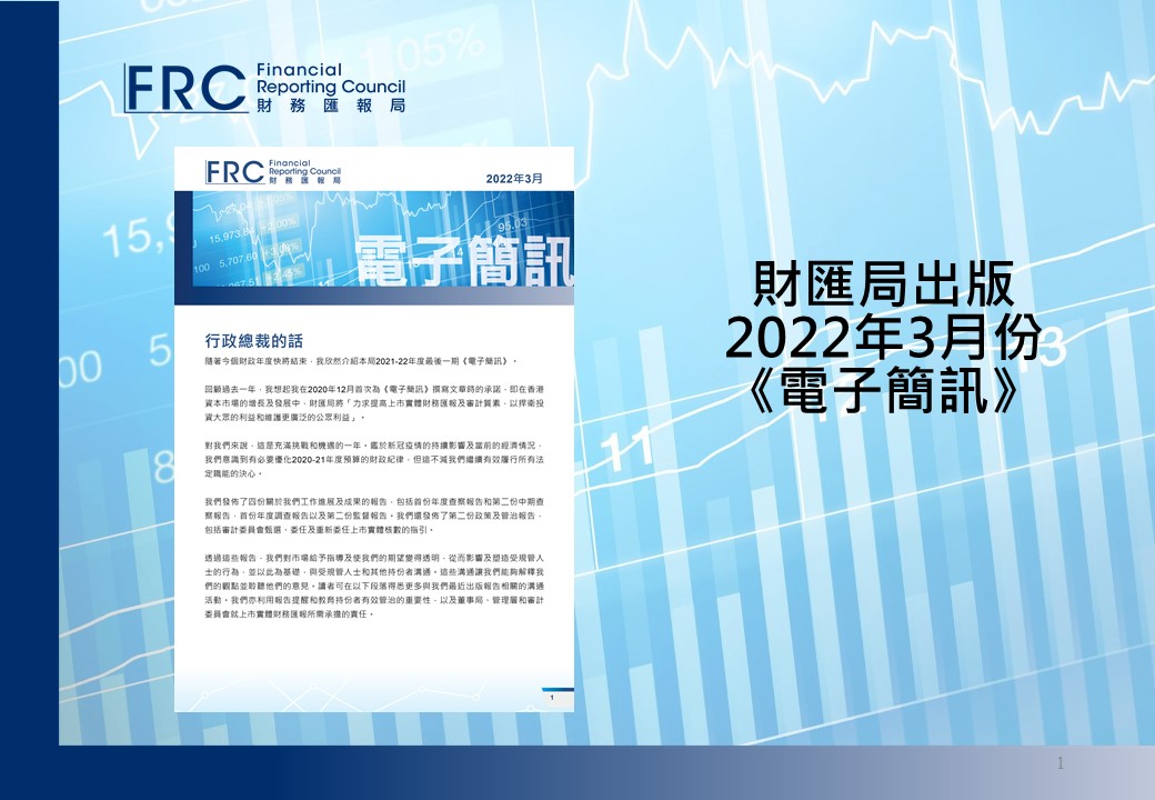 財務匯報局發布了最新一期的《電子簡訊》 (2022年3月份),闡述會計專業進一步改革的進展、與本局紀律處分職能相關的公眾諮詢,以及本局第二份中期查察報告、第一份年度調查報告以及審計委員會指引相關的研討會和工作坊。