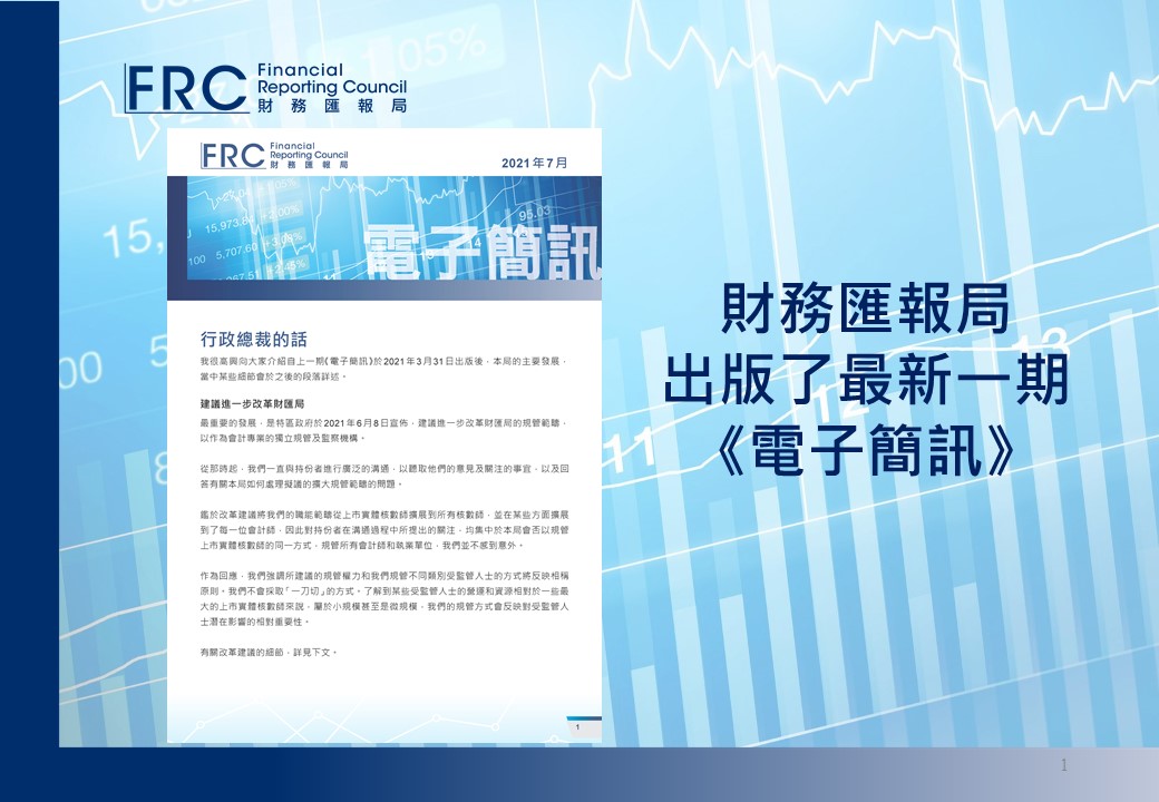 財務匯報局發布了最新一期的<<電子簡訊>> (7月份),展述本局的主要發展,包括建議的進一步改革、監管合作、出版報告及第二屆暑期實習生計劃。請按此瀏覽。